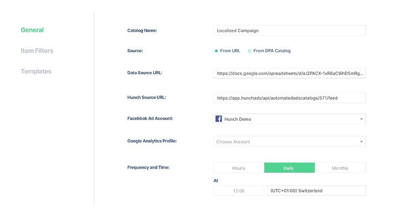 In a nutshell, each item in your feed has a different text, image, description, and so on. No matter what creative templates you wish to use (videos or images), Hunch uses these dynamic and static creative assets to create 100s of ads at once.