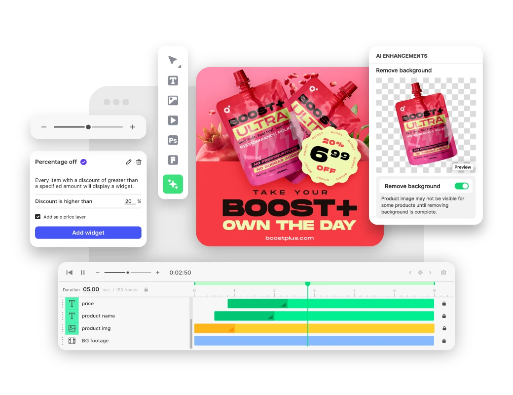 Design once, adapt everywhere. Use data-driven templates, dynamic elements (like price, location, weather), and Hunch AI tools to build, personalize, and scale image and video creatives at speed.